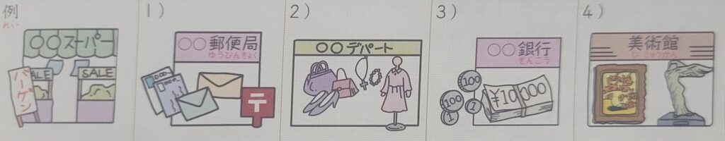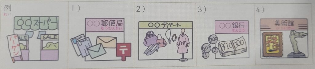 1) 郵便局(ゆうびんきょく)へ行きます。 去郵局。