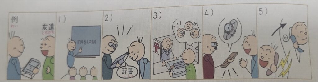 けさ図書館へ行きました。図書館で太郎ちゃんに会いました。太郎ちゃんにといっしょにビデオを見ました。わたしは旅行の本を借りました。