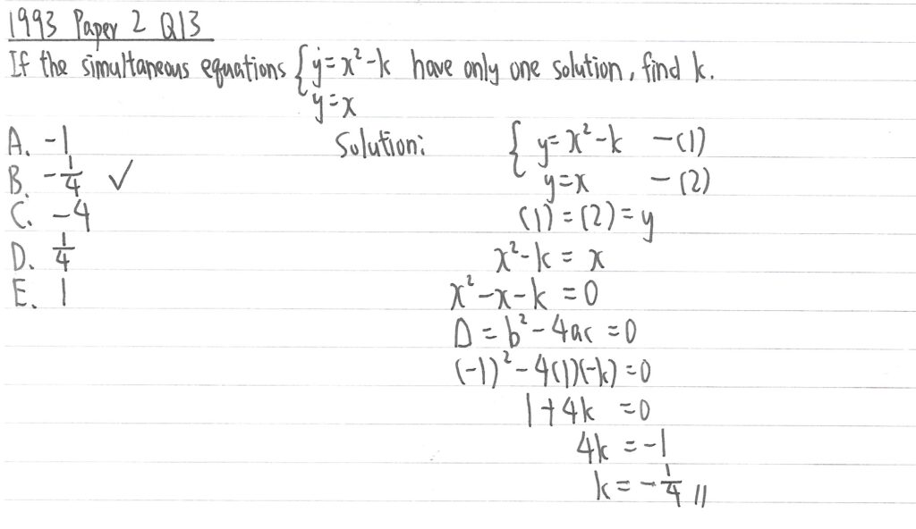 此題可以把兩條公式的右式相等,從而得到一組二次方程。重點字眼是「只有一個答案 have only one solution」,以「一個重根」處理,所以應是等於0,從而計算k的值。