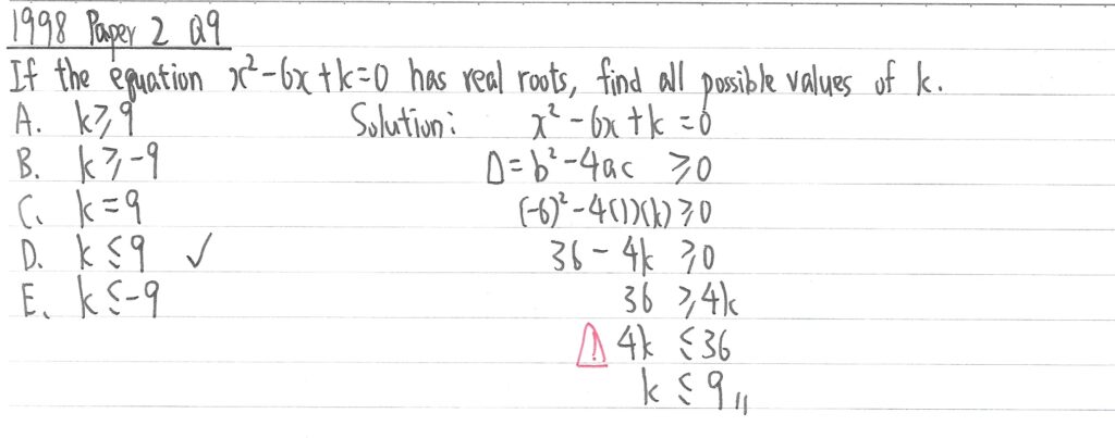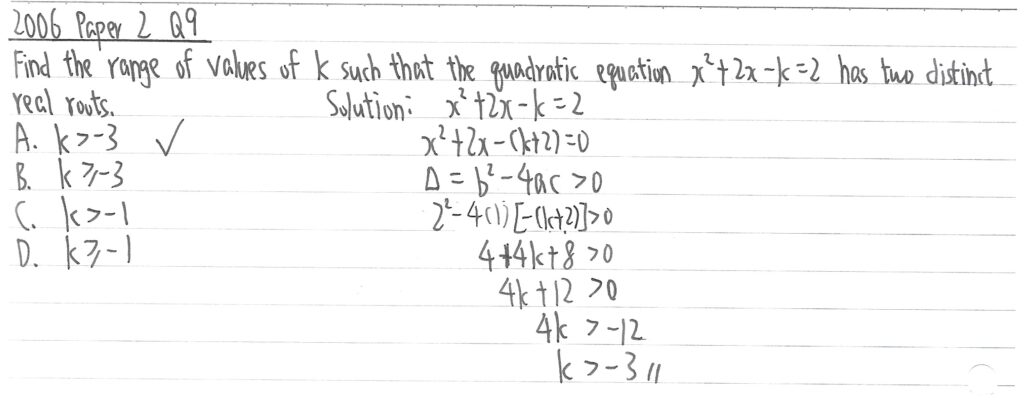 此題字眼是「有實根 has real roots」,但並無指明是多少個,故以「最少一個實根」處理,利用大於或等於0,從而計算k的值域。