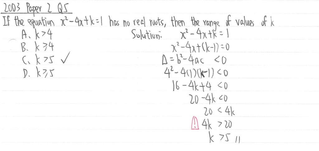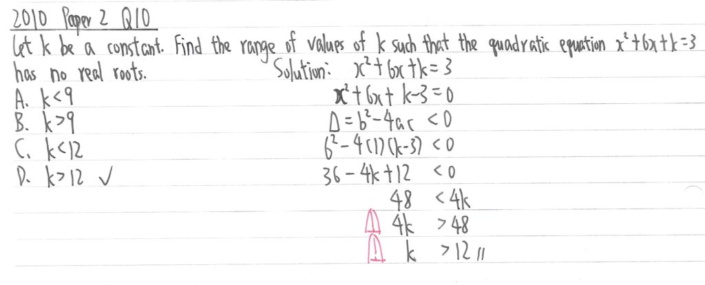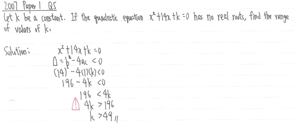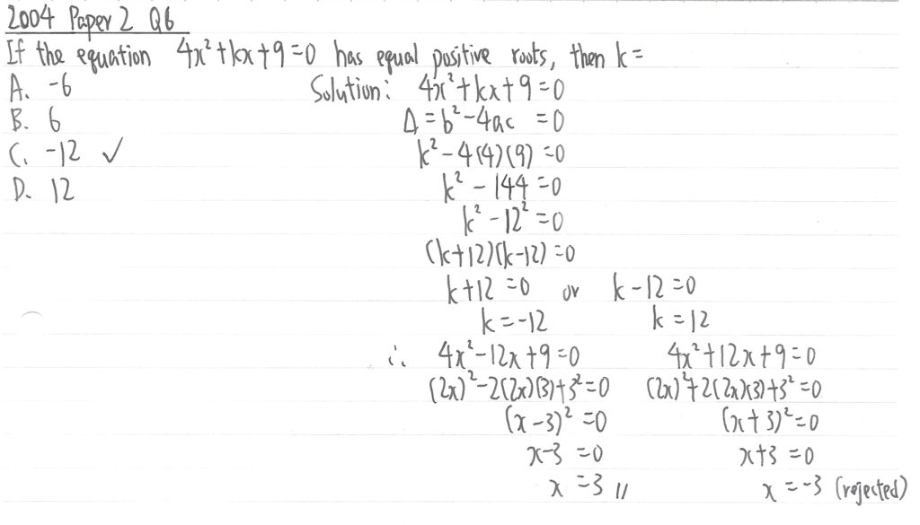 此題字眼是「有正數重根 has positive equal roots」,所以應是等於0。先利用二次方程計算k值,再利用兩個k值分別計出x值,如x值是負數,相關的k值便要捨去。