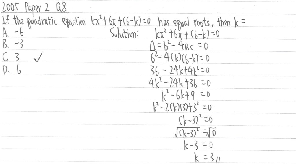 此題字眼是「有重根 has equal roots」,所以應是等於0。再利用二次方程計算k值(此題可利用(a-b)2=a2-2ab+b2作分解)。