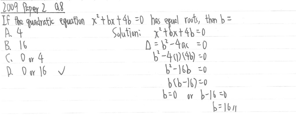此題字眼是「有重根 has equal roots」,所以應是等於0。再利用二次方程計算b值(其實抽b出來已完成一大半了)。