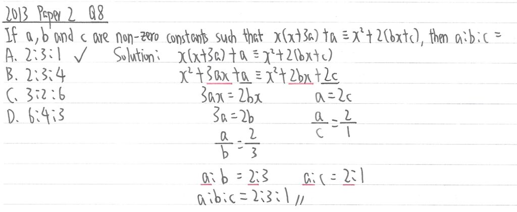 此題是夾雜「比」(Ratio)考問,其實只需懂得「交叉相乘」,便可計算出各自的比例。由於兩個比例中的a同是2,所以可以直接計出a:b:c的比例。