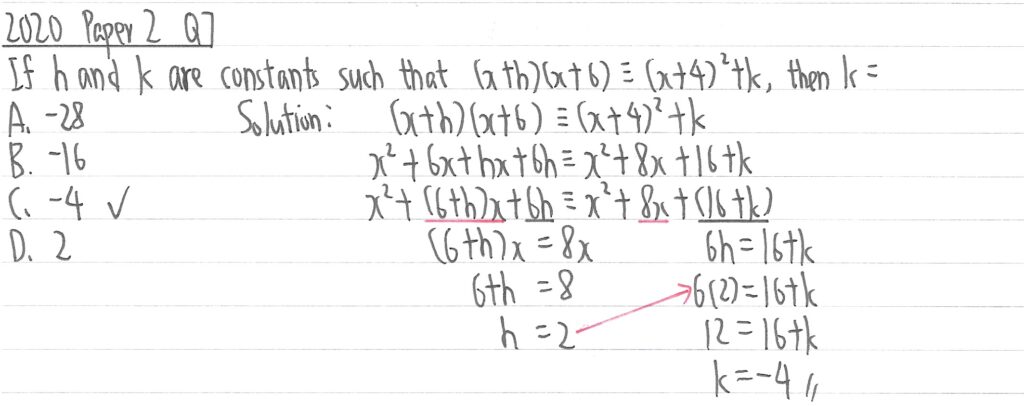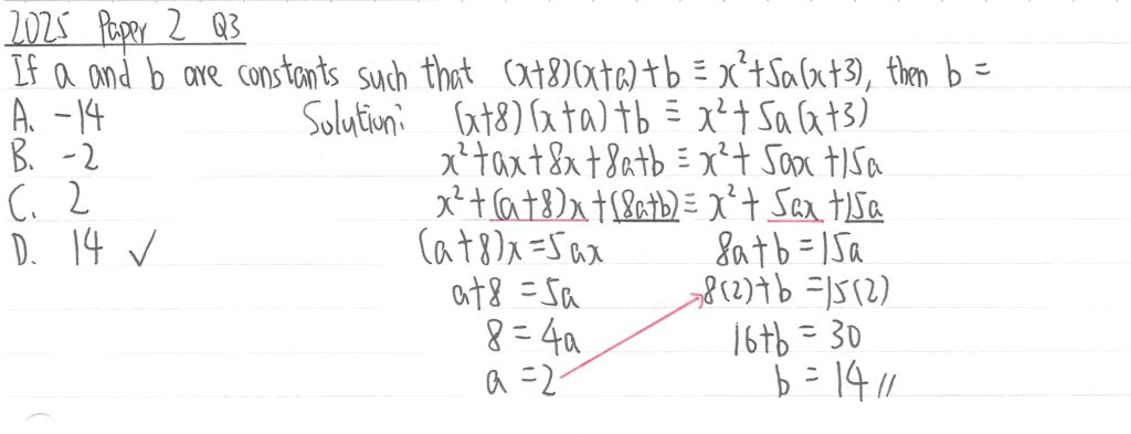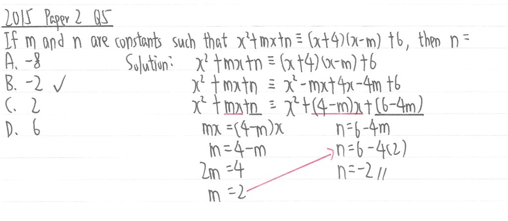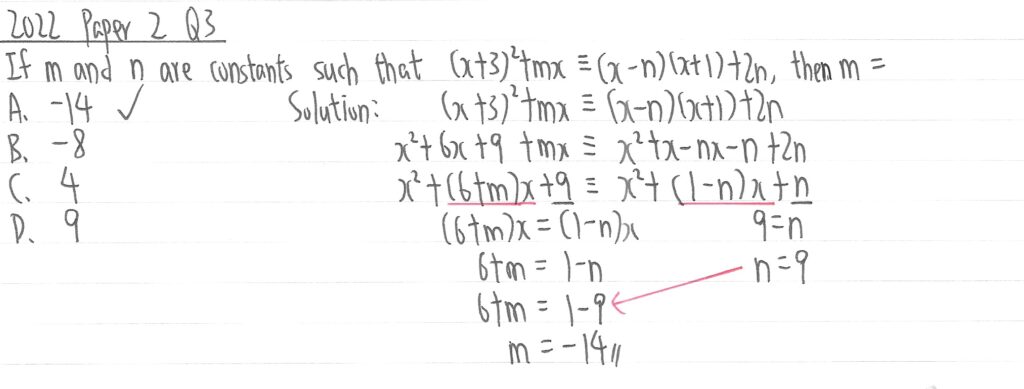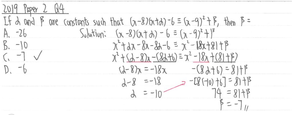 此題其實除了用x項做比對外,還可以用常數項比對,因為在x2項中已求到其係數是4,所以常數項中仍可計算到4+28=-4n,即n=-8。