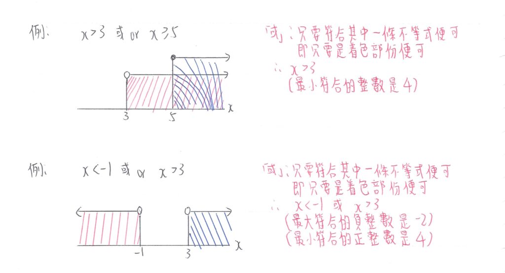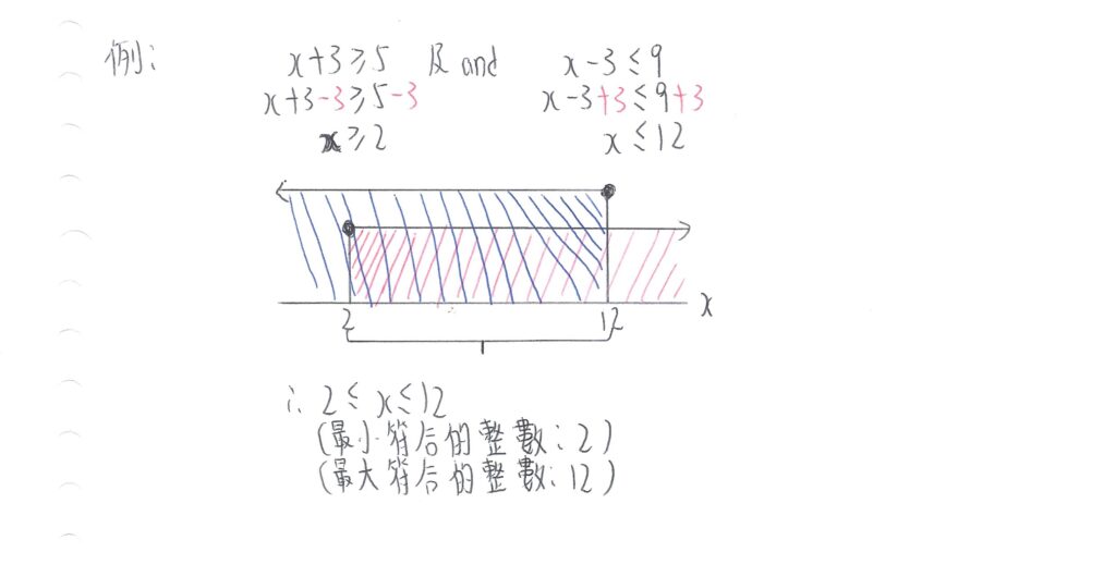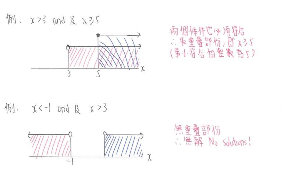 「及」即是所求的間距(Range),是兩條不等式均符合的。即是說,在數線上,兩條不等式所包含的範圍(即重疊範圍)才是題目要求的範圍。如最終答案是數線上沒有重疊範圍,則是「無解」(No solutions)。如下圖: