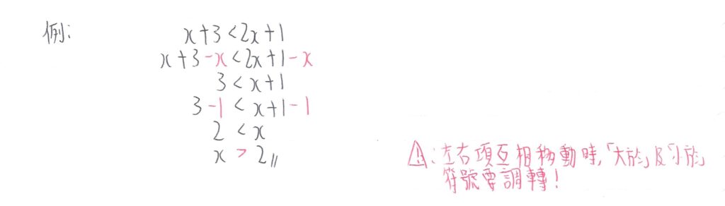 在此情況下,我們會看到x被放到右邊,而題目要求是把x放到左邊。當左右兩邊互相調轉時,中間的符號也要轉方向,即由「<(小於)」轉為「>(大於)」,原理就是如此。