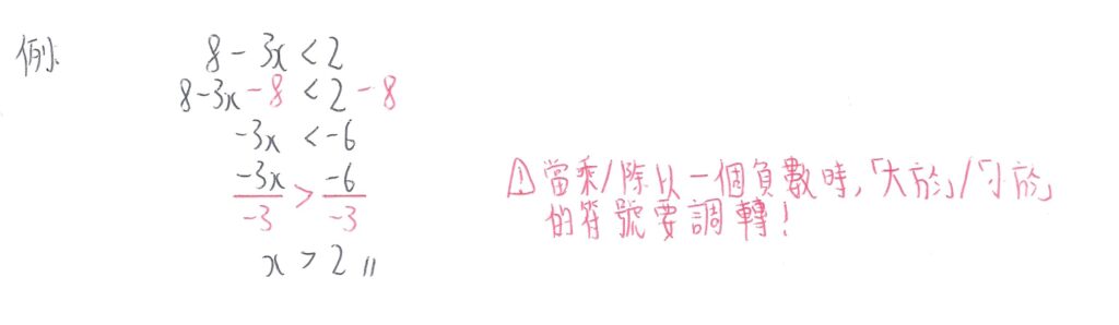 如未知數在左邊,而且要全式除以一個正數時,中間的符號不用調換。下圖是例子: