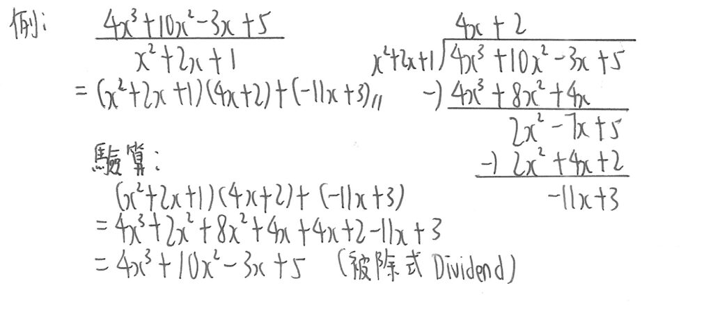 此題做法與例3相同,雖然此題被除式最高為3次方,除式為2次方。由於除式最大為2次方,可以餘數的次數最多可以是1次方。
