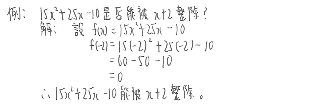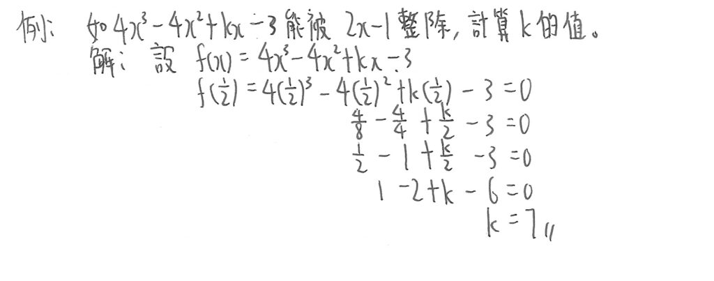 留意:餘式定理只能應用於當除式最大次方是1時,如出現x的次方大於1,此定理不適用。