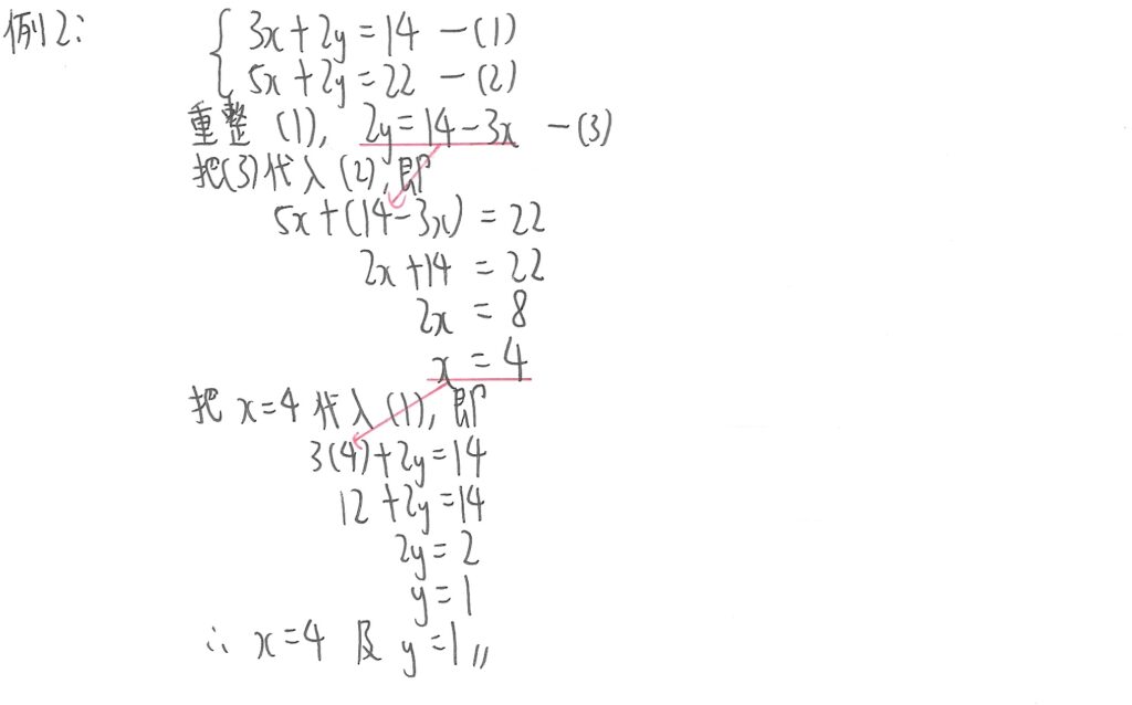 此題兩式各自的x和y項的係數不同,不過可以先把其中一式的數值倍大,使到兩式中,x或y值的係數一樣,如上圖中把(1)式係數及數值全部乘以2,使兩式同時出現2x,便可以把(1)式減去(2)式,先計算y值,再代入其中一式求x值便可。
