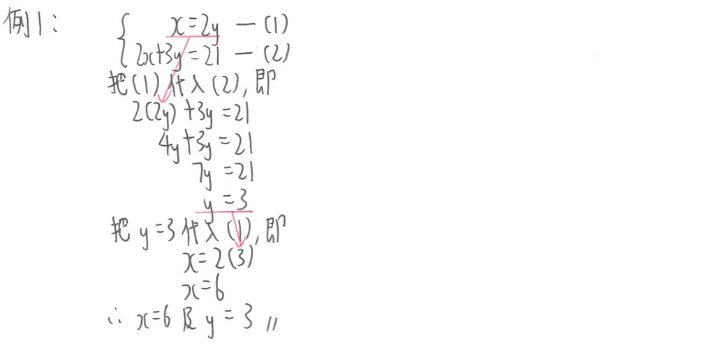 此例子的兩式中,左邊同時有x和y,而兩項的係數也是大於1。不過大家可以看到兩式中的y係數也是2,所以我們可以先在其中一式中,以主項轉換方式,以2y作為主項,然後把右邊的值代入到另一式,先計算x值,再用計算出來的x值代入到其中一條公式再計算y值便可。