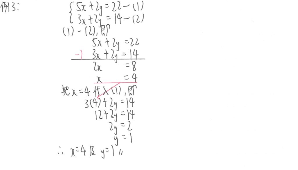 此例其實和上面例2一樣,不過我們現在先把(1)式減去(2)式,左邊同類項相減,同時右邊數值相減,使左邊暫時只有x值,先計算x的值,再把其代入其中一式,計算y的值便可。