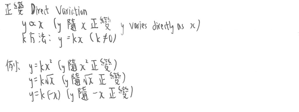 通常我們會利用k方法(k-method)表示,上段例子我們的k就是10,因為y隨10x正變,即是當x位乘客上車,總收入是$10乘x。