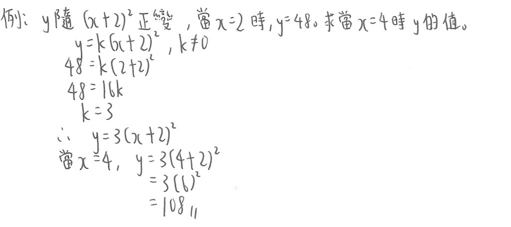 題目前半部提供了當x=2,y=48,先設一組公式,左邊是y,右邊是含x的,右邊另加k,表示y隨含x的數值正變。
