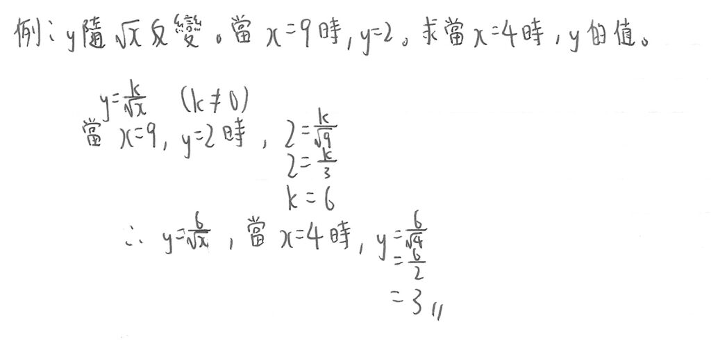 這類例子做法和正變一樣,只是含x的部份要放在分數中的分母,先找出k值,再解答問題後半部求y值。