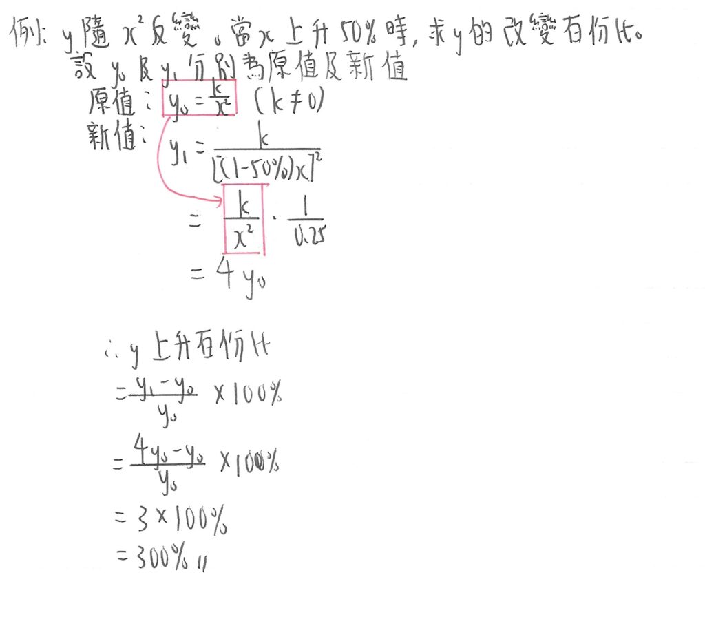 問及y的百份比改變也是和正變同樣處理方法,不過含x部份要放在分數中的分母。