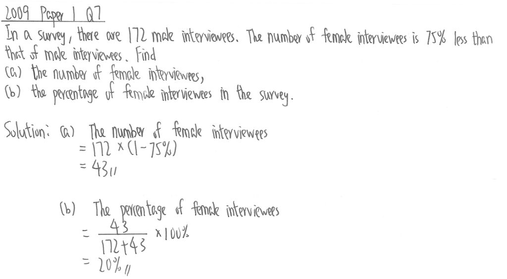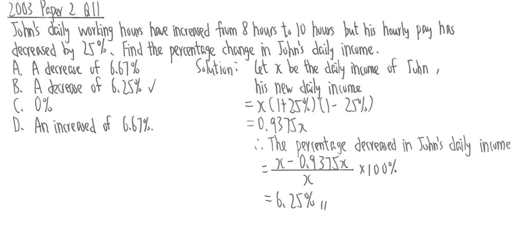 此題可先設x是John的日薪。首先,他的工作時數由8小時增加到10小時,所以增加25%,故先乘(1+25%),計算10小時的總時薪,後半部則指出時薪減少了25%,所以再乘以(1-25%),反映他最新每小時可得薪金金額。最後利用百份比改變得出答案。