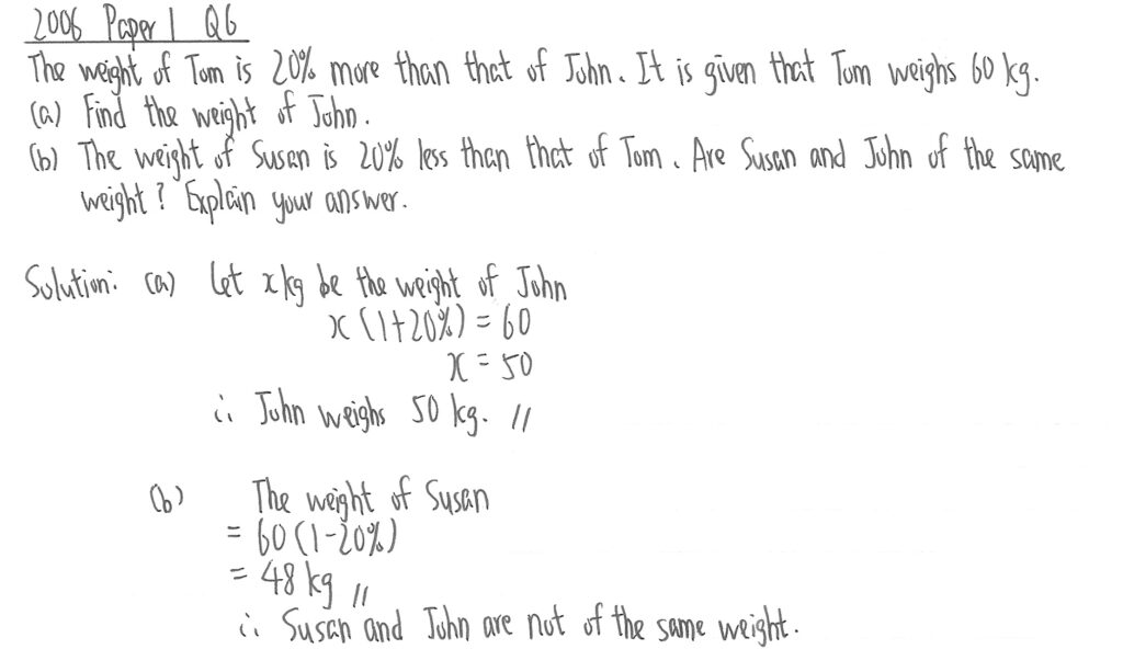 題目首先提供Tom的體重,(a)部問題是反向問John的體重,所以應用先設x為John的體重,乘以(1-20%)便是Tom的體重去作運算。