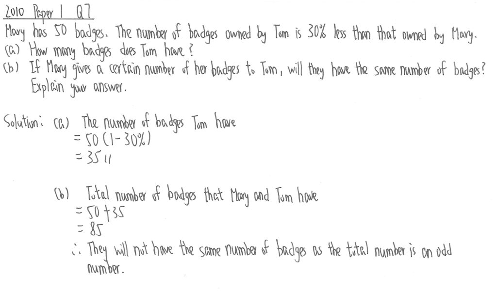 (a)部提供了Mary擁有的襟章數量,題目要求計算Tom擁有的數量。已知Mary的數量,所以Tom的數量,可以用(1-30%)與Mary擁有數量相乘。