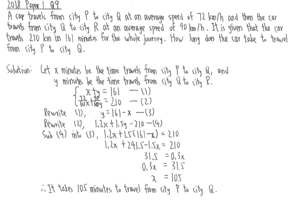 此題需要小心的是,由P城到R城總共需時161分鐘,而全程210公里,在駕車時以時速計算,所以在設公式時需要把計算距離的公式化作每分鐘的速度,使兩者的單位相同,然後可以用聯立方程式計算出由P城到Q城所需的時間(以分鐘計)。