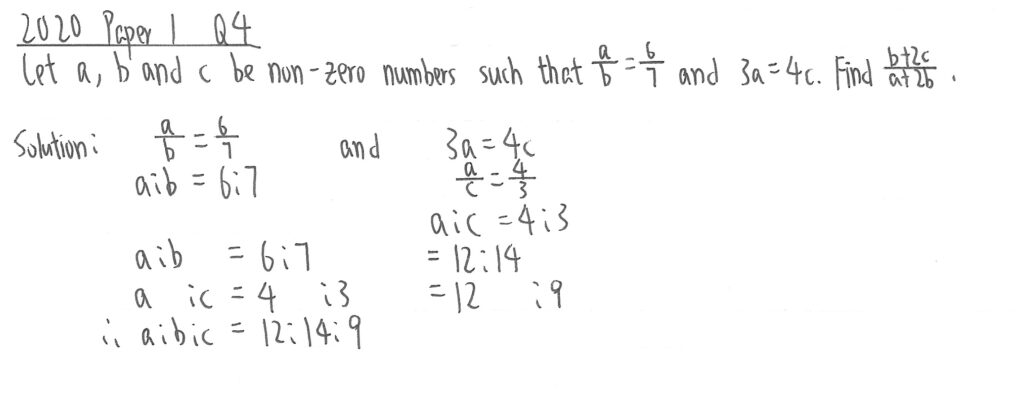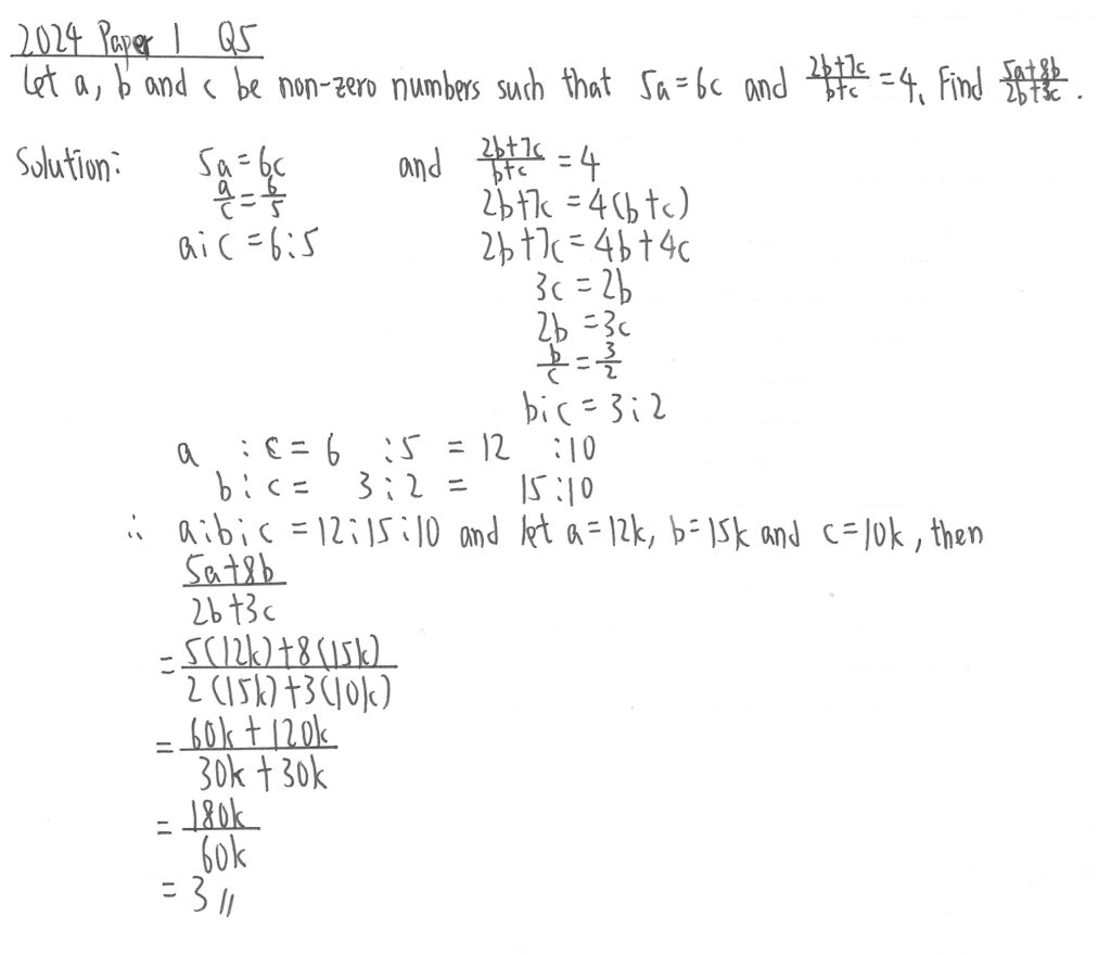 先利用交叉相乘,兩條公式先分別計算出a:c及b:c的比例。由於兩者c的數值不同,所以先找出兩個c值的最小公倍數,然後a:c兩個數值各自乘以2,同時b:c的數值各自乘以5,使c值同樣等於10,便可得出a:b:c的結果,再用k方法,代入題目最後分數a、b及c各自的值作加減及約簡便能得出答案。