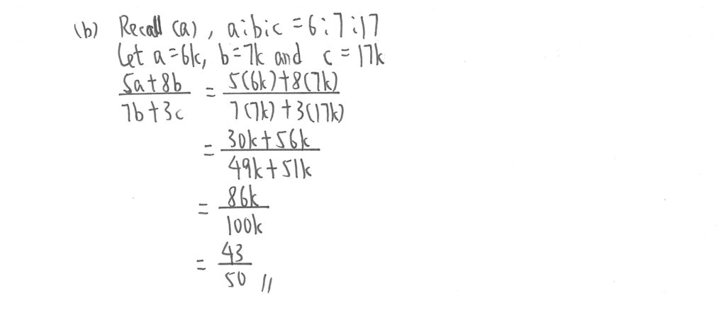 先利用交叉相乘,兩條公式先分別計算出a:b及a:c的比例。由於兩者a的數值不同,所以先找出兩個a值的最小公倍數,然後a:c兩個數值各自乘以2,同時a:c的數值各自乘以3,使a值同樣等於12,便可得出a:b:c的結果。然後利用k方法,代入題目最後分數a、b及c各自的值作加減及約簡便能得出答案。