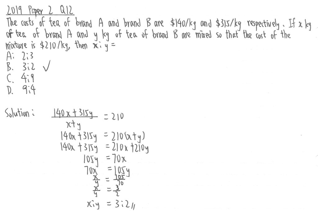 此題其實除了比例,還夾雜了「加權平均數」(Weighted average)的概念。即是說,分子是所用茶葉的總成本,而分母則是使用了多少公斤的茶葉,從而得出平均成本為$210。最後經運算及約簡得出x:y的比例。