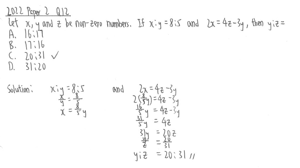 此題涉及三個數值的比例,所以先分拆做兩個比例,即第1個:第2個,同時第2個:第3個,以交叉相乘的方式計出y的值。我們發現到,左邊有8y,而右邊則有1個y,而答案並不需要計算y的值,所以可以把右邊全式乘以8,使兩式同樣是8y,便可以把兩邊的另一邊值做一個等於,從而計算及約簡得出答案。