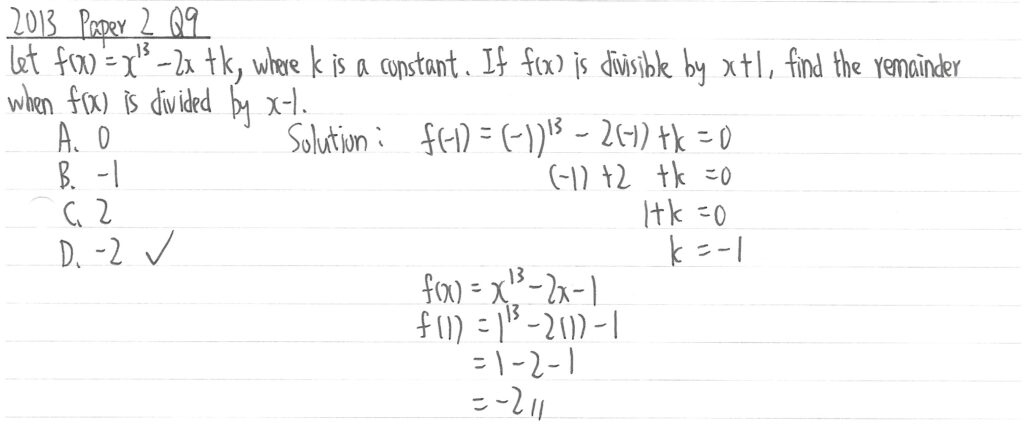 餘式定理及因式定理題目,於卷二通常會獨立出題,並可能會夾雜其他課題一同考問。因此,除了餘式定理及因式定理要熟讀外,還需要熟讀其他課題,尤其是以下課題: