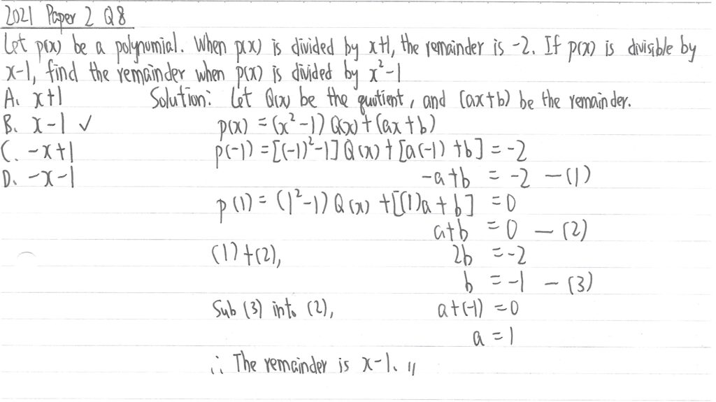 此題已知p(x)的除式(x2-1),所以先設商式為Q(x),而餘式是(ax+b),因為除式是2次方,所以餘式最多只會有1次方。已知p(x)被x+1相除時的餘式是-2,所以先設第一組式p(-1)=-2,同時也已知當p(x)能x-1整除,所以設第二組式p(1)=0,再利用聯立方程求出a及b值後得出餘式。兩式其實能夠使商式乘以0,所以商式在此並不重要。