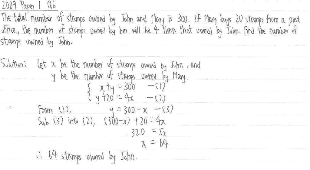 此題只要求計算John擁有的郵票數量,所以當分別設x和y是John和Mary分別擁有的郵票數量後,(1)式可以利用主項轉換方法,把y作為主項,並代入(2)式,使其變成只有x並直接求出John所擁有的郵票數目。