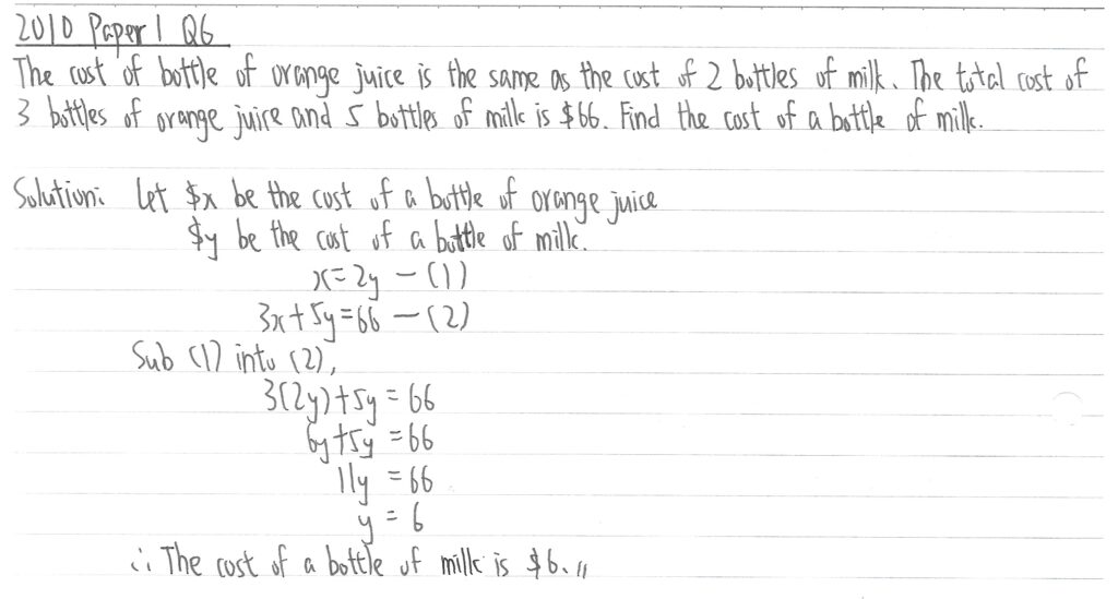 此題只要求計算一樽牛奶的價錢,當分別設x和y是一樽橙汁和一樽牛奶的價錢後,把(1)式的數值代入(2)式,使(2)式全部是y,便可直接計算出一樽牛奶的價錢。